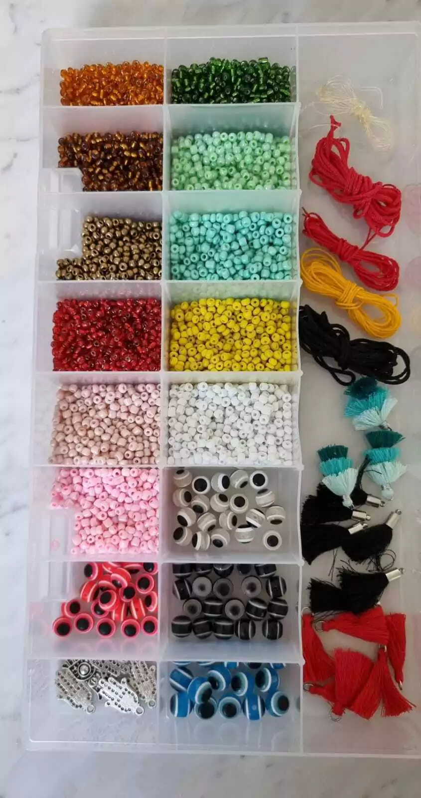 El contenedor plastico es de 33x18cm con 17 divisiones. Viene con 11 colores de mostacillas, 4 diferentes colores de nazar (80 unidades), 6 dijes metalicos de modelo mano de fatima. 2 metros de hilo cola de raton rojo y negro, 2metros de hilo encerado rojo y amarillo y 2 metros de tanza. 5 borlas rojas con argollita, 5 borlas negras con capuchon y 3 borlas verdes en degrade.