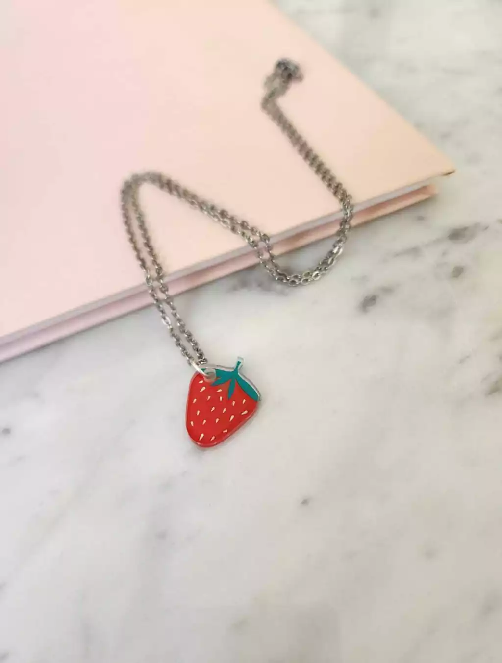 Collar de acero quirurgico de 50cm de largo. Dije de Frutilla de acrilico