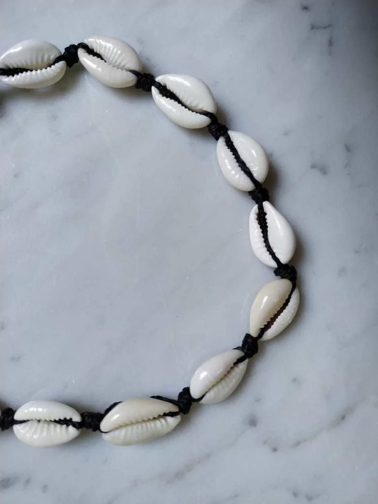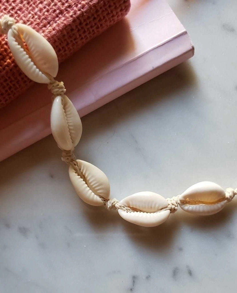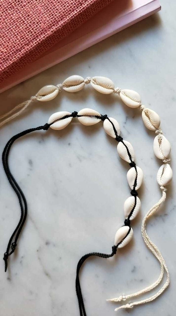 Gargantilla / collar al cuello de hilo cola de raton, caracoles Buzios.