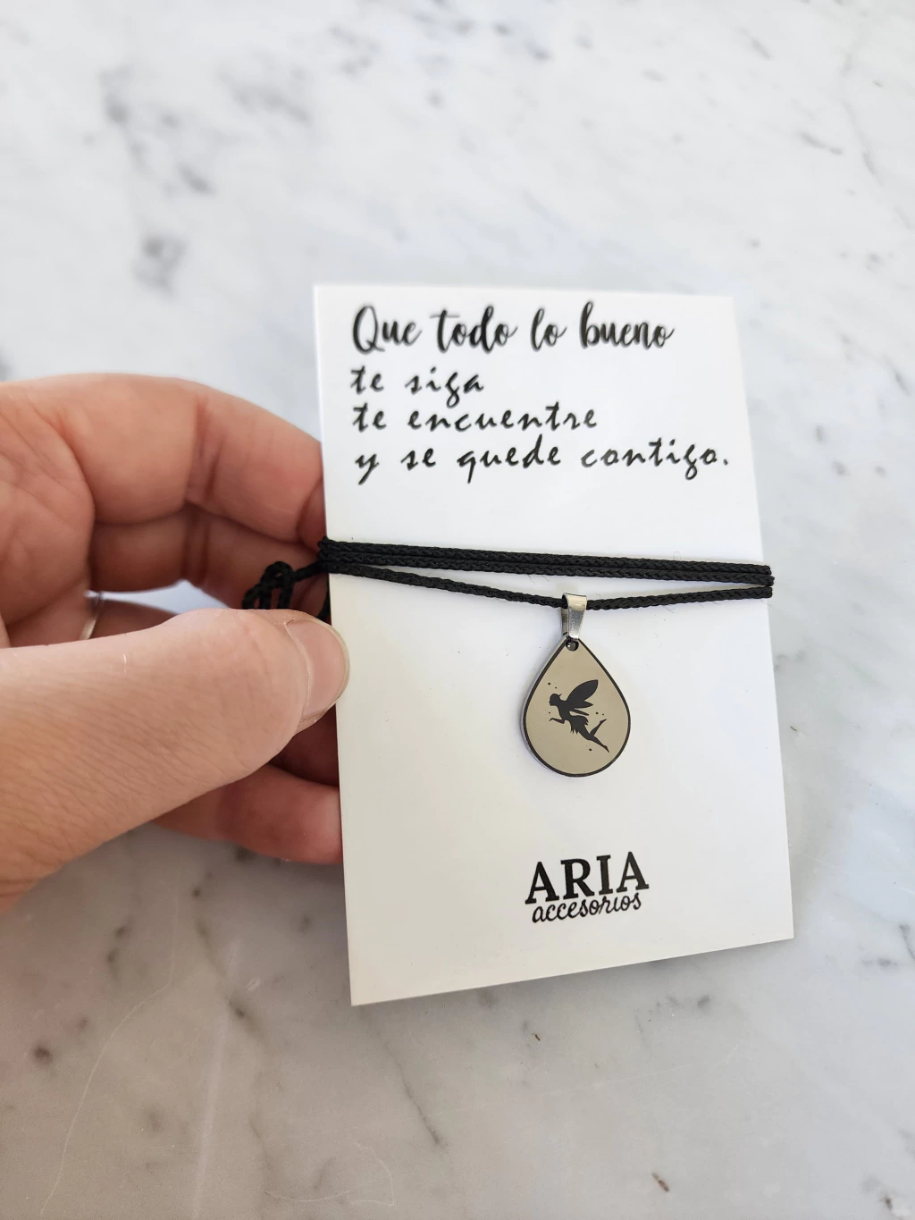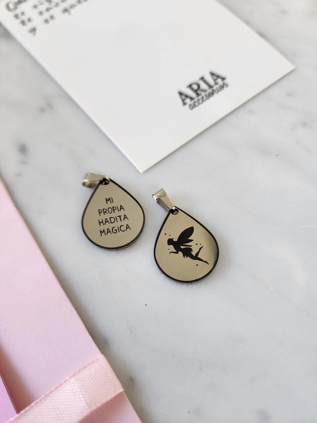 El dije es de acero quirurgico grabado a laser en ambos lados. De un lado el dibujito de hada y del otro lado la frase "mi propia hadita magica"