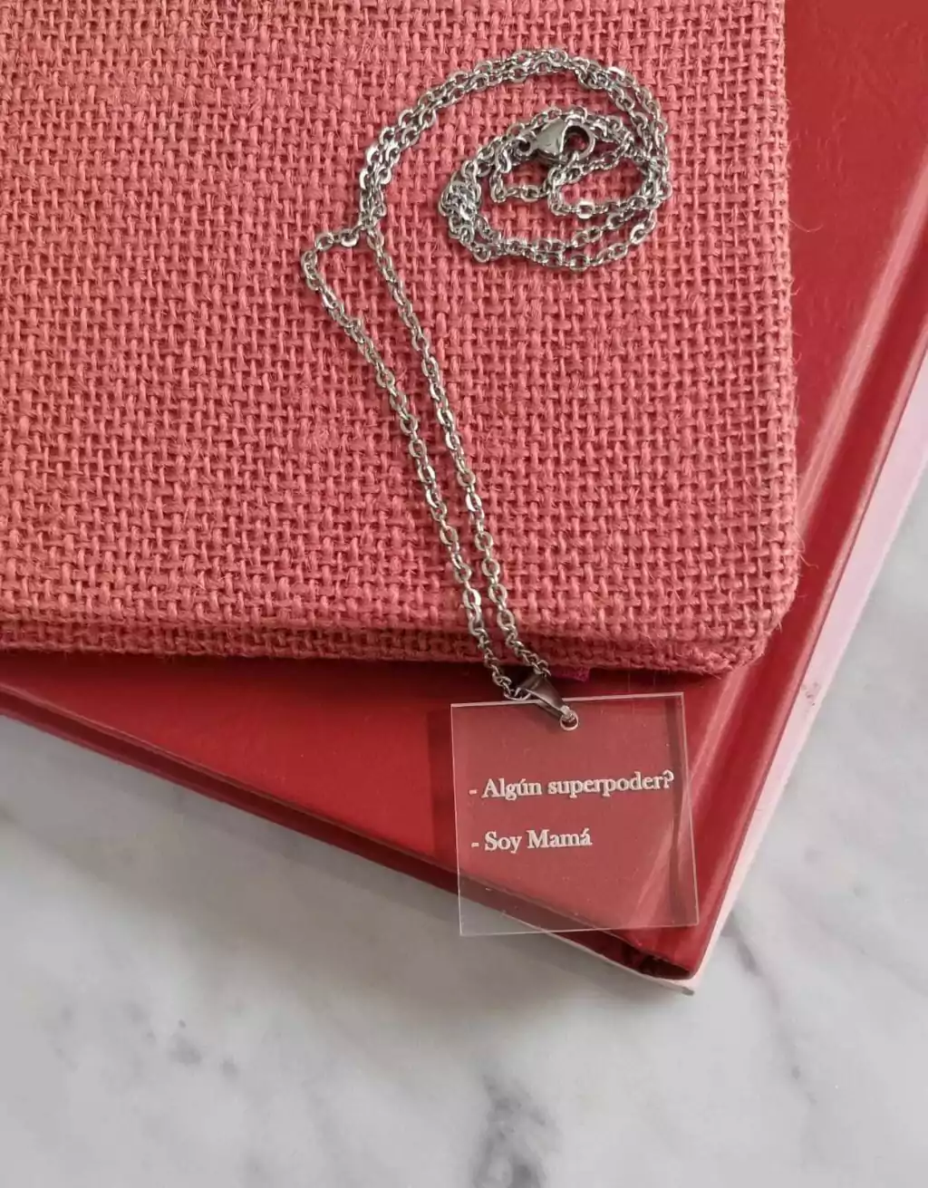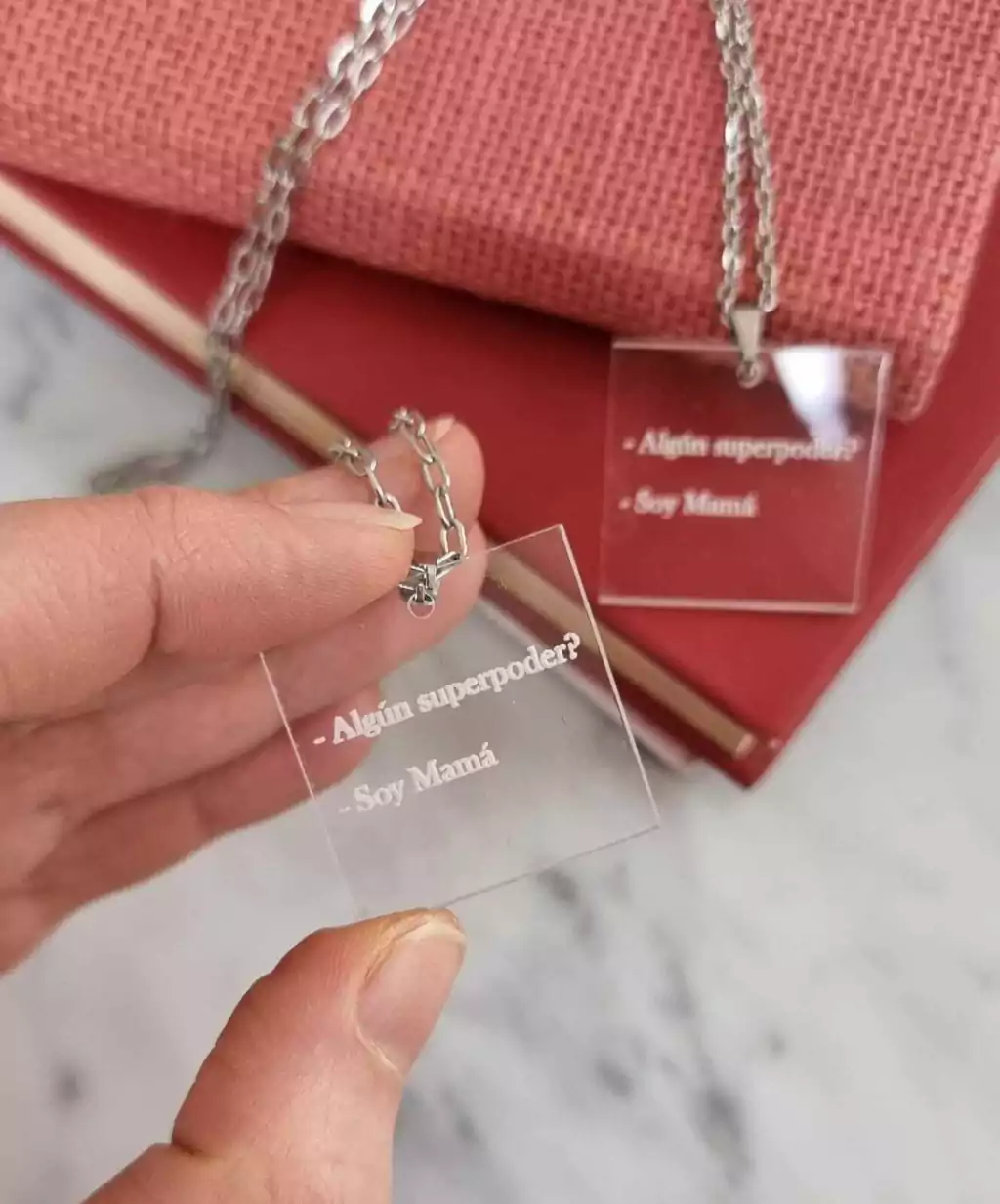 Es un Collar de acero quirurgico y un dije de acrilico color cristal grabado a laser. Es un cuadrado de 3cm de largo por 3cm de ancho, 2mm de espesor