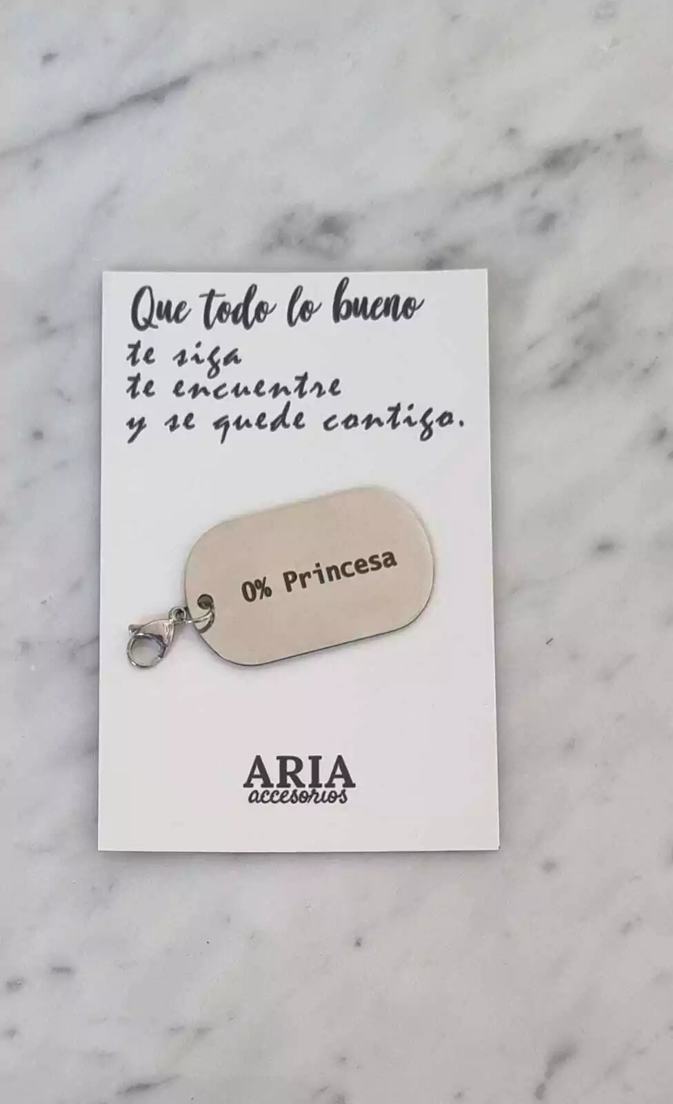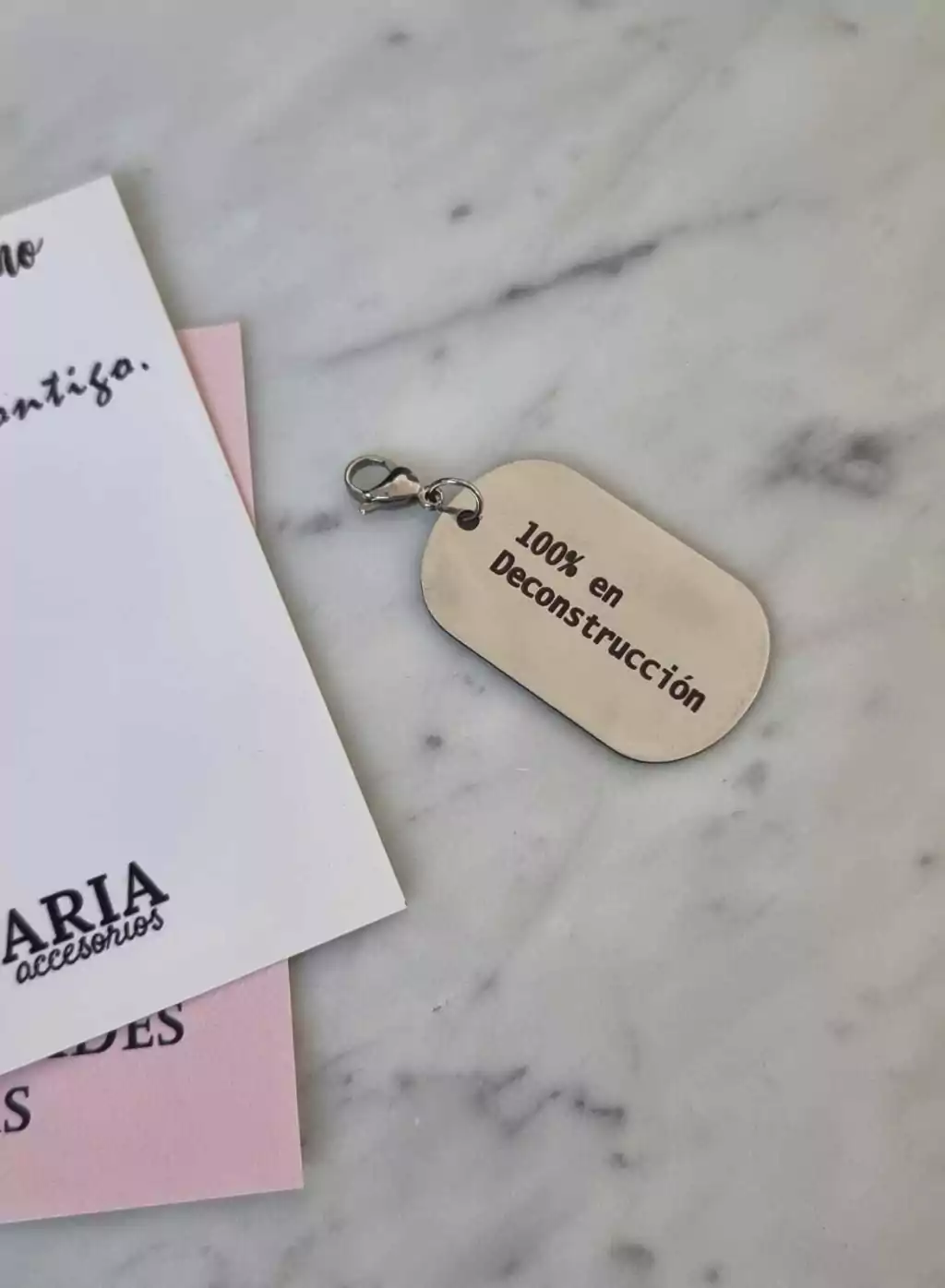 El dije esta grabado a laser, de un lado con la inscripcion "100% en deconstrucción" y del otro "0% princesa"