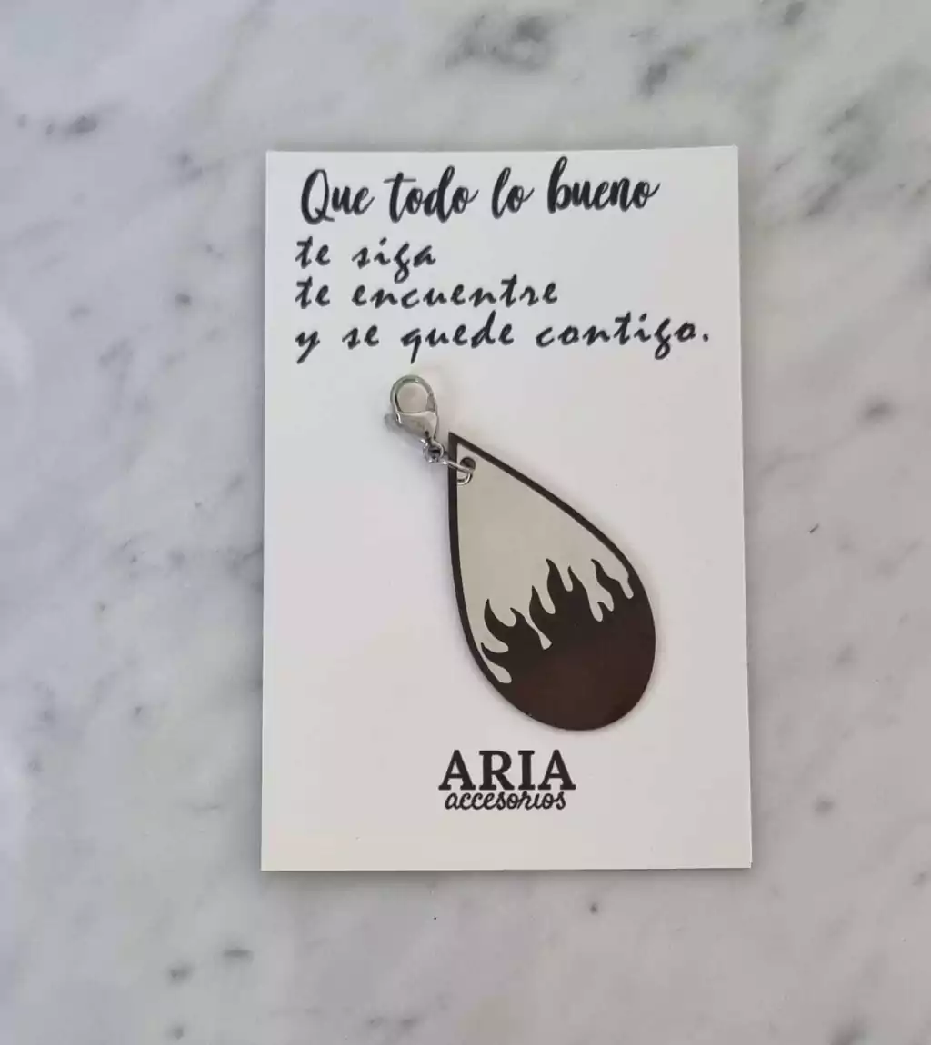 Grabado a laser, de un lado la frase "puro fuego interno" y del otro la imagen de llamas de fuego.