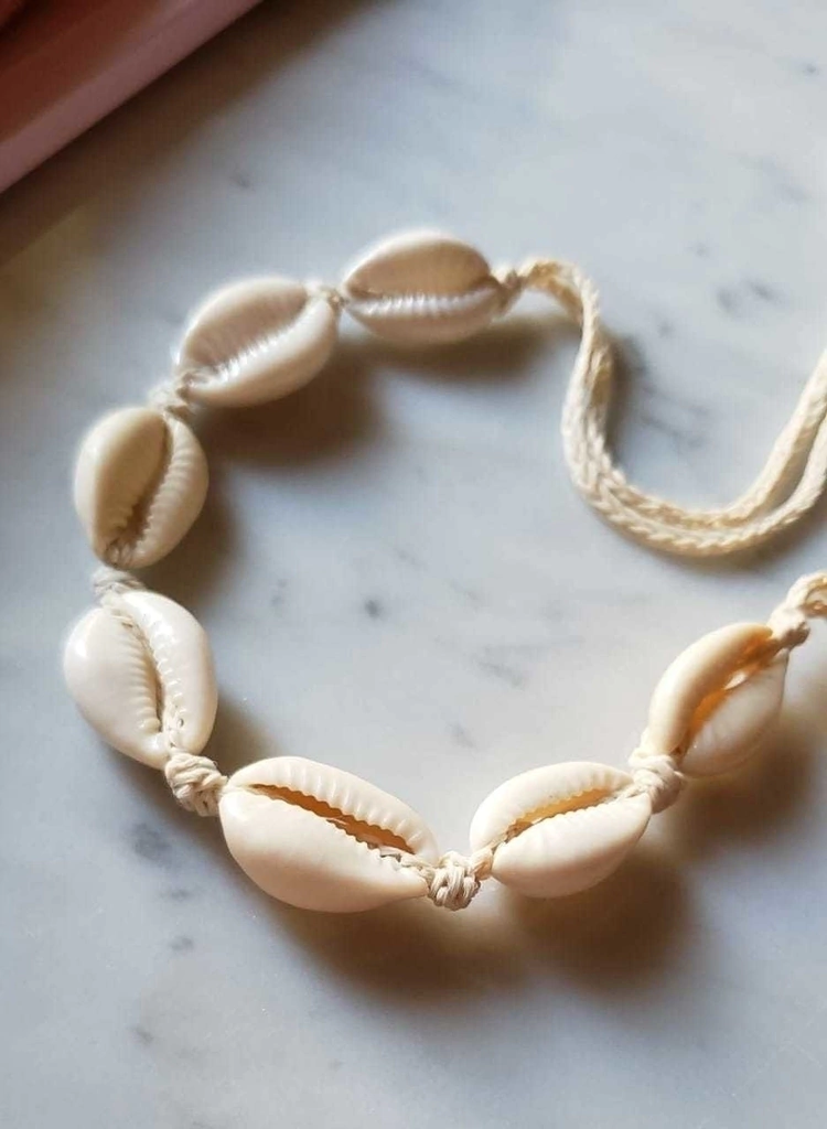 Pulsera / tobillera de caracoles buzios reales, hilo cola de raton, cuencas plasticas